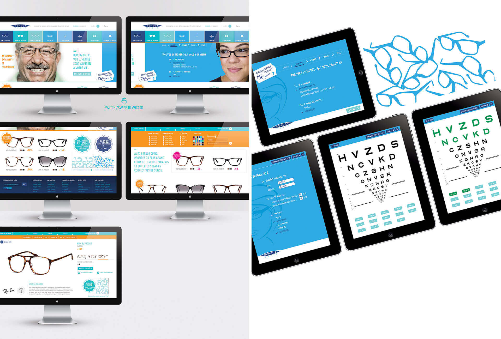 Refonte graphique du site e-commerce Berdoz Optic, avec un wizard de sélection de monture adaptée à la physionomie du client.