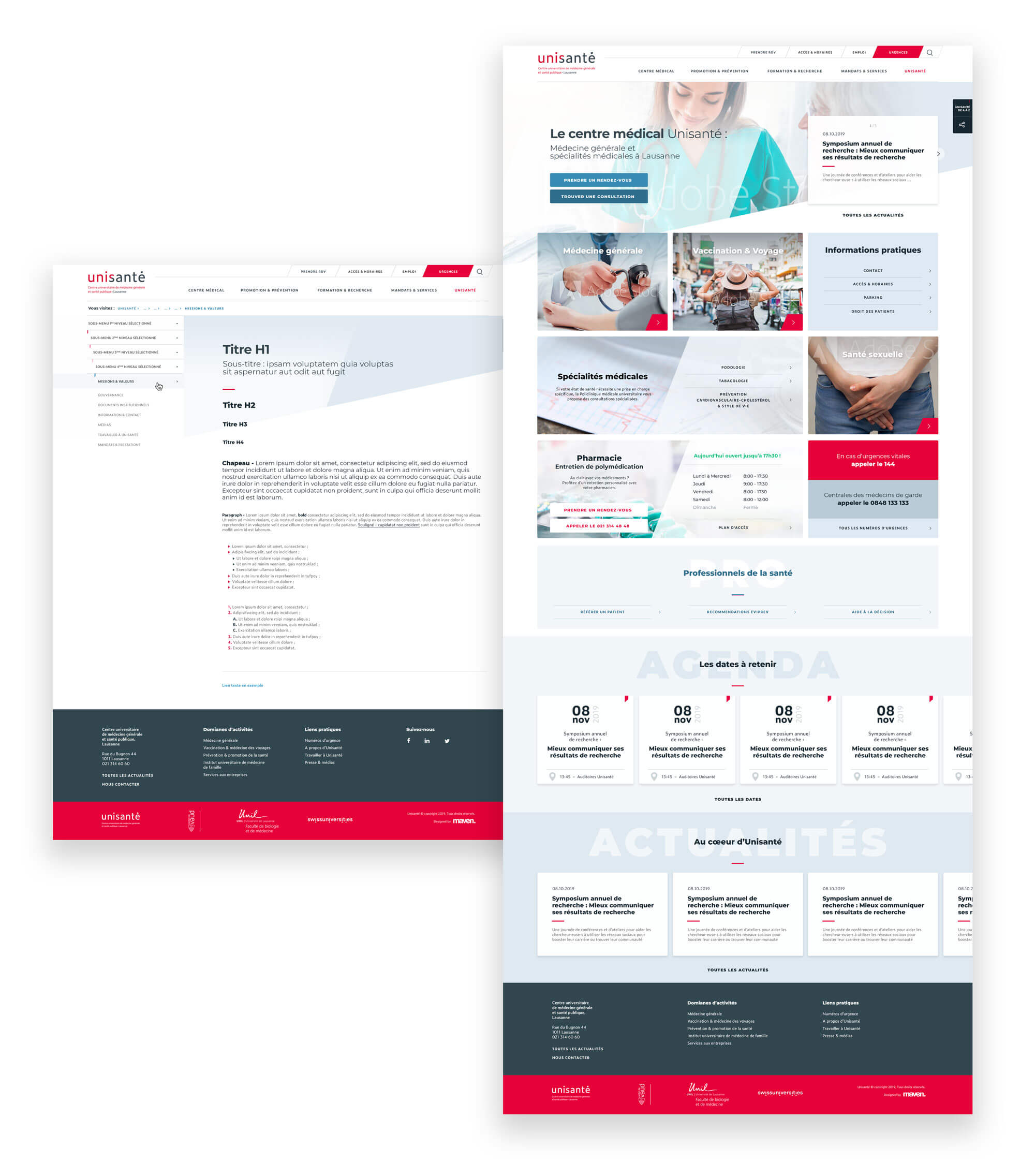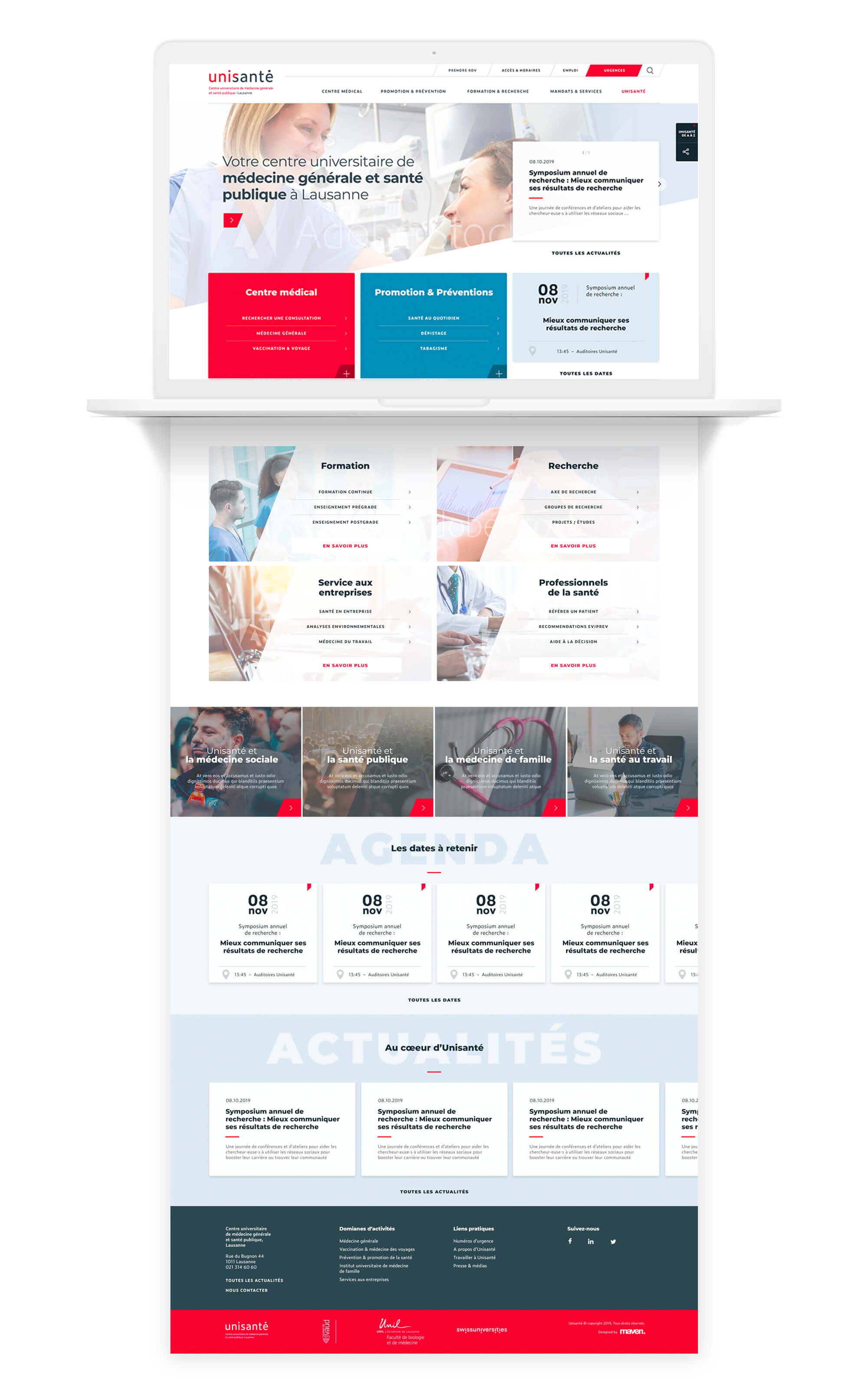 Conception UX/UI pour le lancement du site Unisanté. Cette nouvelle entité est le résultat d'une fusion institutionnelle rassemblant la Policlinique médicale universitaire, l’Institut universitaire de médecine sociale et préventive, l’Institut universitaire romand de santé au travail et l’Association Promotion santé Vaud.